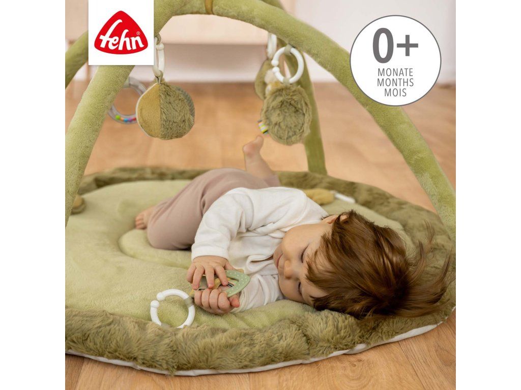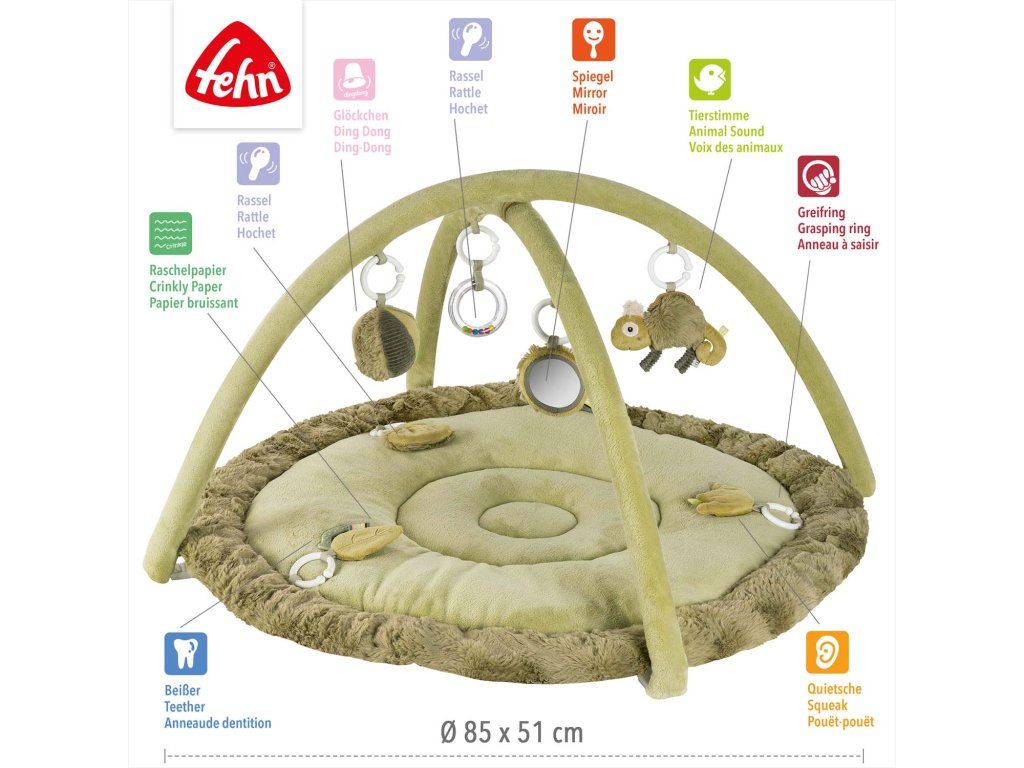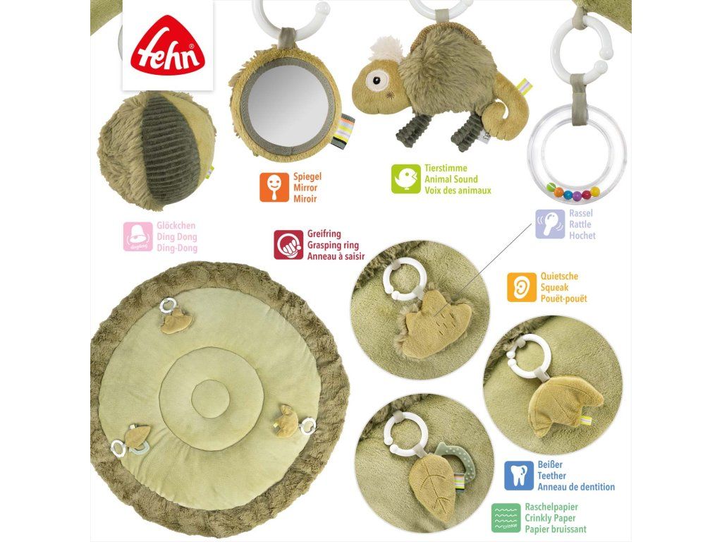Interaktivní deka s chameleonem a prostorem na ležení z různých hebkých materiálů láká miminko k mazlení, zkoumání a hraní. Tři odnímatelné prvky se šusticím papírem, pískátkem a chrastítkem na dece podporují hmatové vnímání a koordinaci oko–ruka.