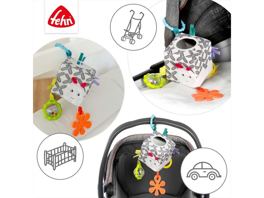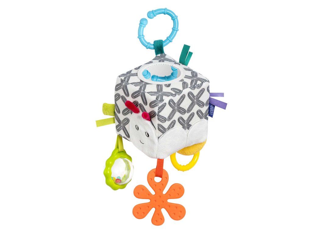 Díky chrastítku, úchopovým kroužkům, rolničce, měkkému kousátku a zrcátku nabízí