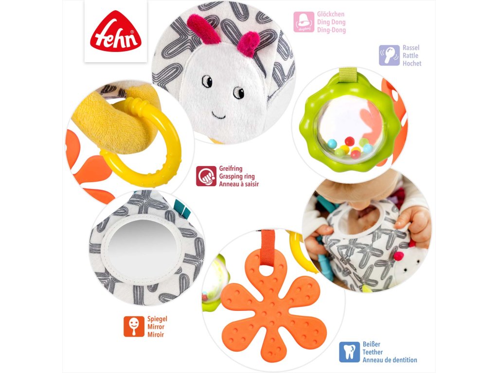 Díky chrastítku, úchopovým kroužkům, rolničce, měkkému kousátku a zrcátku nabízí