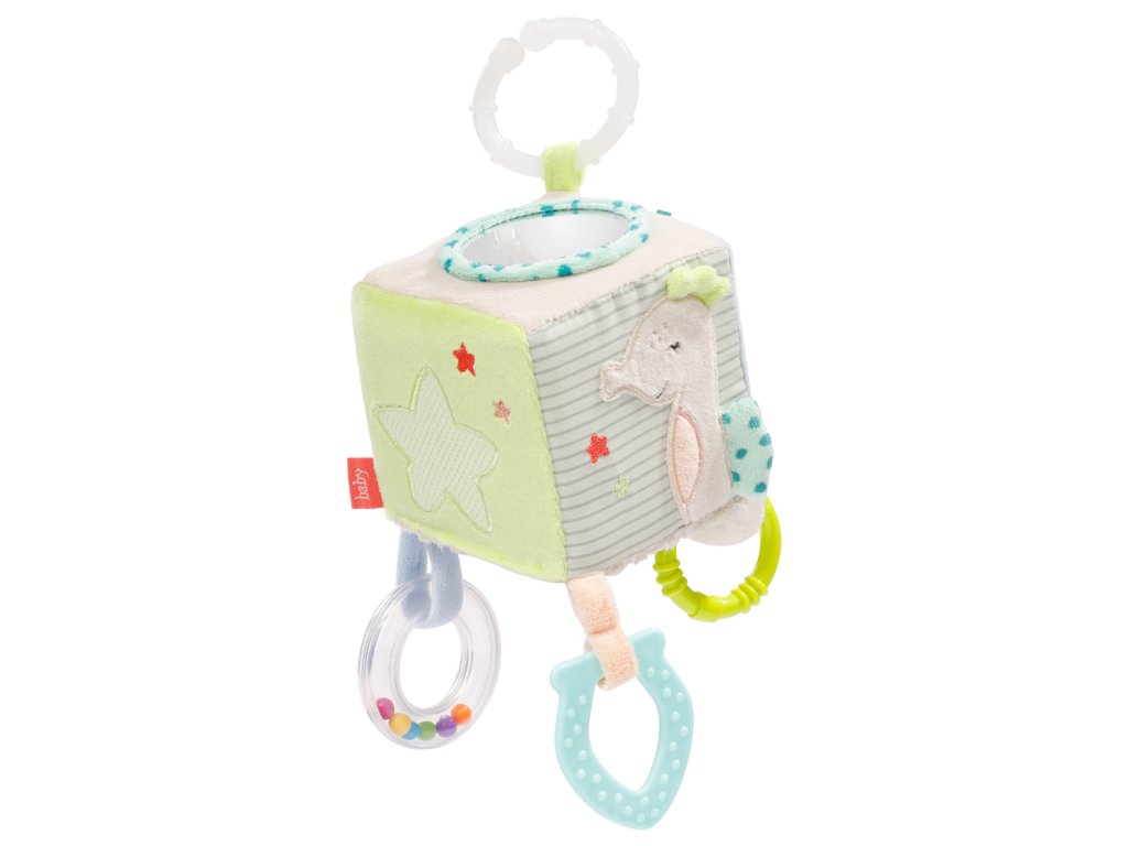 Díky praktickému C-kroužku lze látkovou kostku s mořskými živočichy snadno připevnit na kočárek i autosedačku, takže se rychle stane věrným společníkem dítěte!