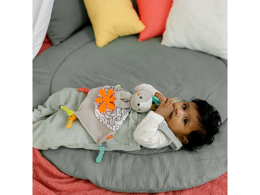 Spousta úchopových prvků, měkké materiály a hlavička ovečky jsou prvky, které stimulují smysly miminka a tím se děťátku rozvíjí hmatové smysly. Praktický kroužek na dudlík zajistí, že se dudlík neztratí při žádném dobrodružství. Neonově oranžové kousátko pomáhá s prořezáváním zoubků.