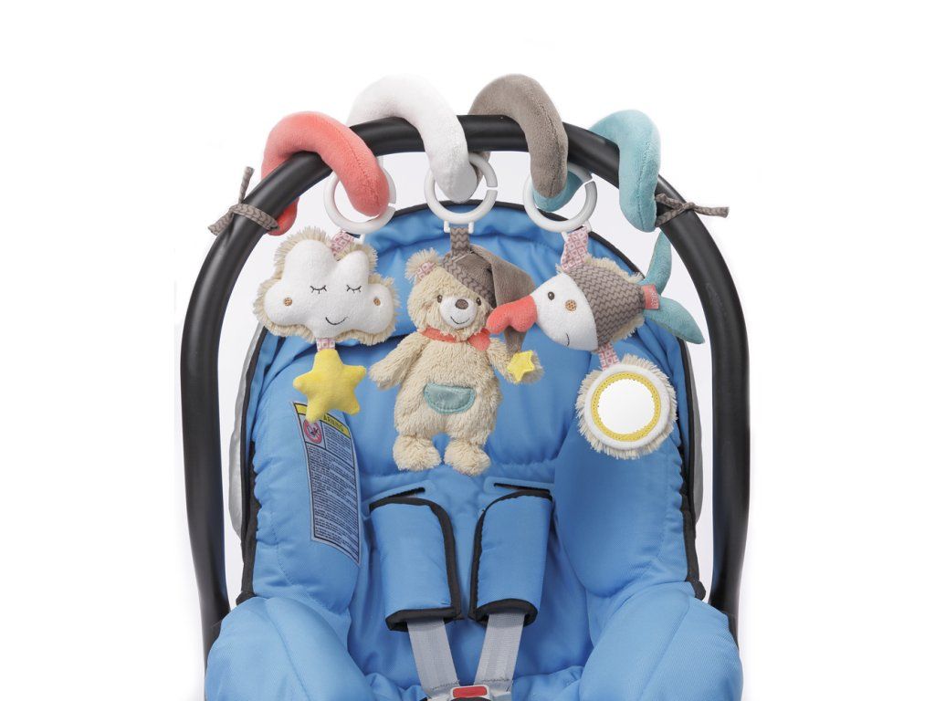 Barevná, plyšová spirála je příjemná na dotek a díky zavěšeným hračkám vybízí děti k objevování nových podnětů. Stimuluje jejich smysly a poskytuje jim zábavu. Na spirále jsou tři veselé přívěsky ve tvaru mraku, medvídka a rybičky. Hračky na spirále jsou pohyblivé díky kroužkům a lze je individuálně měnit.