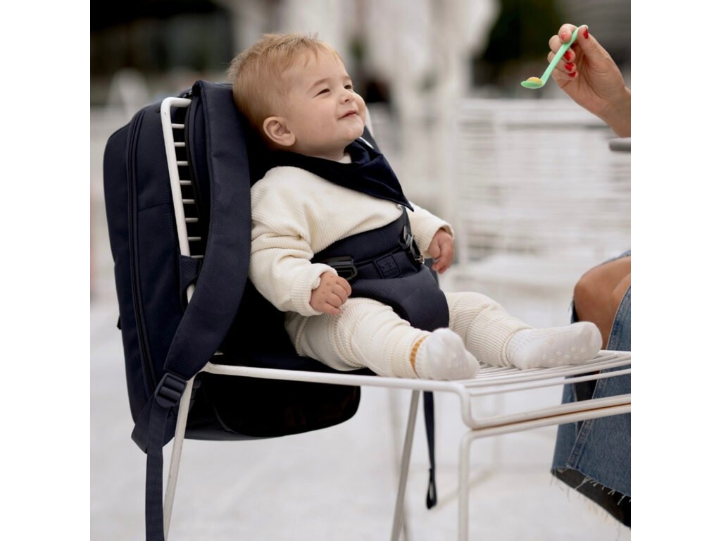 Je to taška na plenky, kterou táta používá v kanceláři, a jediný batoh na světě, který se na cestách promění v dětskou sedačku.