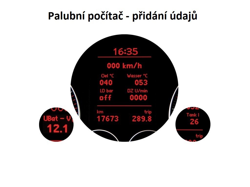 • DIS Přidání zobrazení následujících dat na displeji přístrojové desky (k dispozici pouze pro vozidla s červeným DIS): tlak turba v barech ( závisí na vozidle), teplota oleje v ºC/F, teplota vody v ºC/F, zbývající obsah paliva v L, rychlost v km/h - m/h, otáčky za minutu