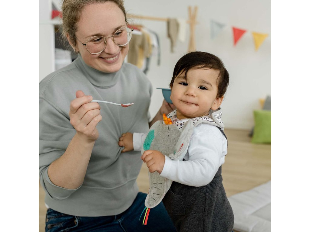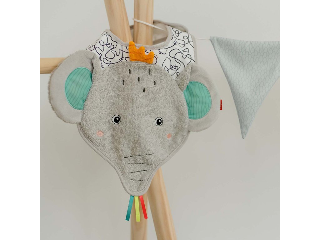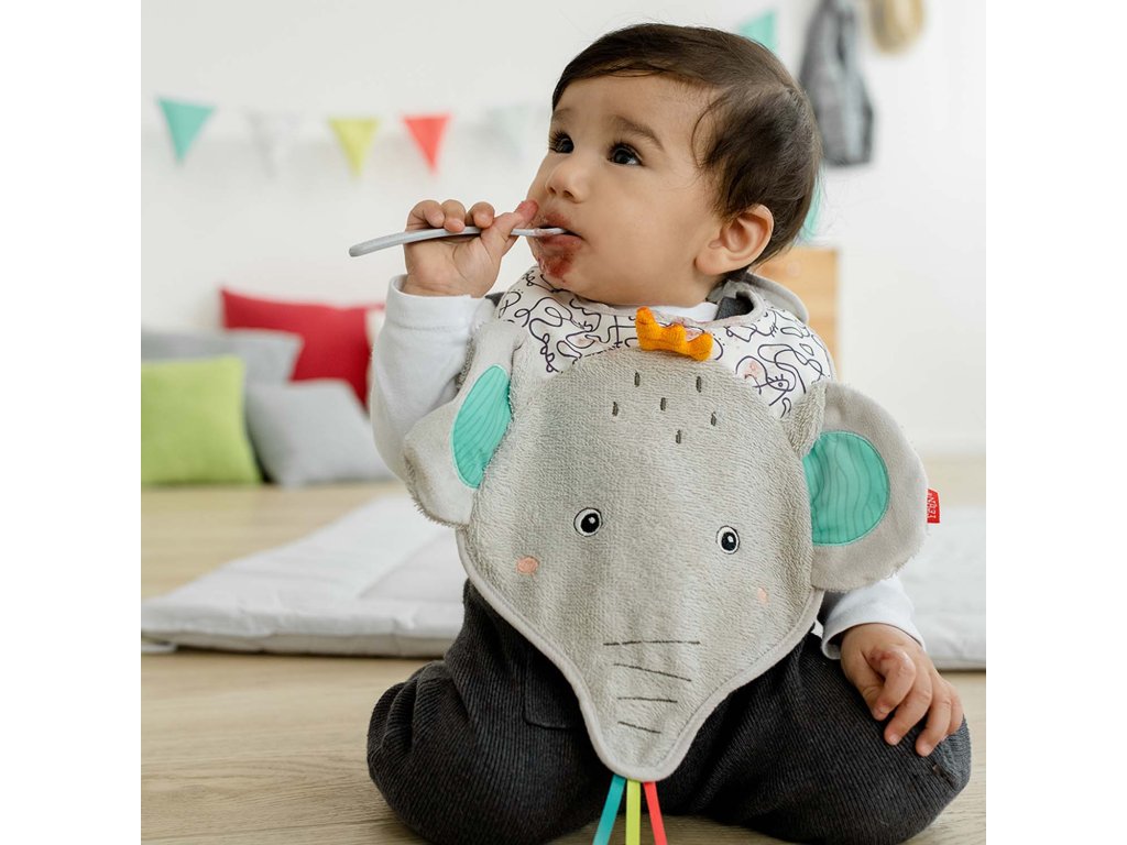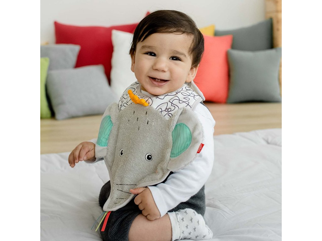Bryndáček na slintání, hadřík na vyplivnutí a ochrana proti polití v jednom: Šedý bryndáček z froté ve tvaru slona nabízí optimální ochranu při jídle. Zapínání na suchý zip usnadňuje připevnění. Materiál odolává častému praní a každodennímu používání. Dokonalý dárek pro miminko.
