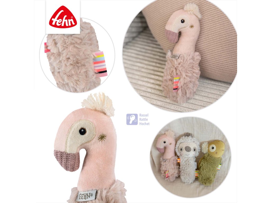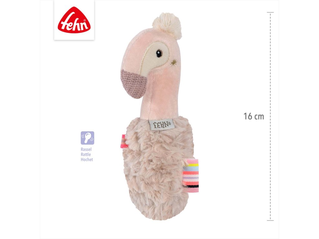 Chrastítko ve tvaru hebkého plyšového plameňáka je věrným společníkem pro