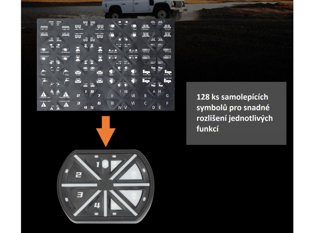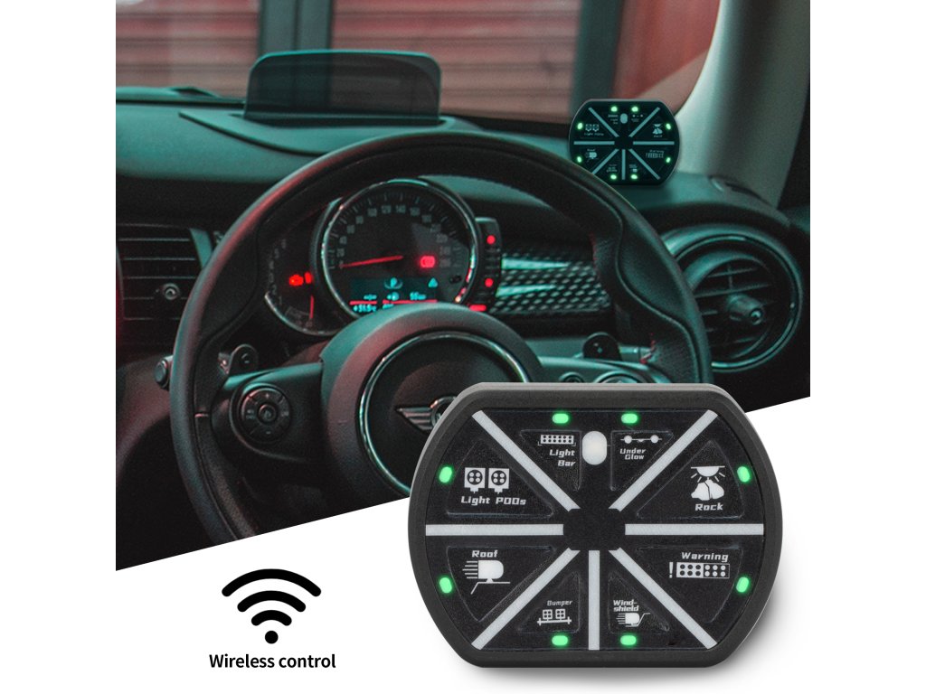 8 skupin spínacích výstupů, takže můžete externě ovládat např. 8 skupin LED světel a příslušenství dohromady, aniž byste zabírali další místo. Vysoká citlivost, stabilita a silná odolnost proti rušení. Snadno nainstalujete do 12 V a 24 V vozidel. Je vhodný pro různé typy automobilů, terénní vozidla, pickupy, nákladní vozy atd. Různé spínače pro ovládání obecného elektrického vybavení ve vozidle: světlomety a jiná zařízení. Ovládací panel lze instalovat na přístrojovou desku, středovou konzolu, sedadlo, strop, A-sloupek ve vozidle atd. Přizpůsobitelné samolepicí štítky, které vám pomohou určit každé tlačítko podle vašich konkrétních potřeb.