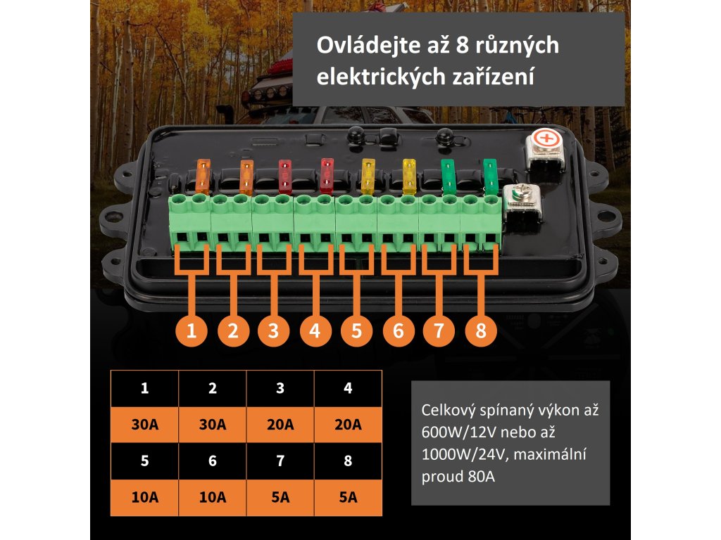 Dálkově ovládaný spínač 12/24V, 8-kanálový, 80A