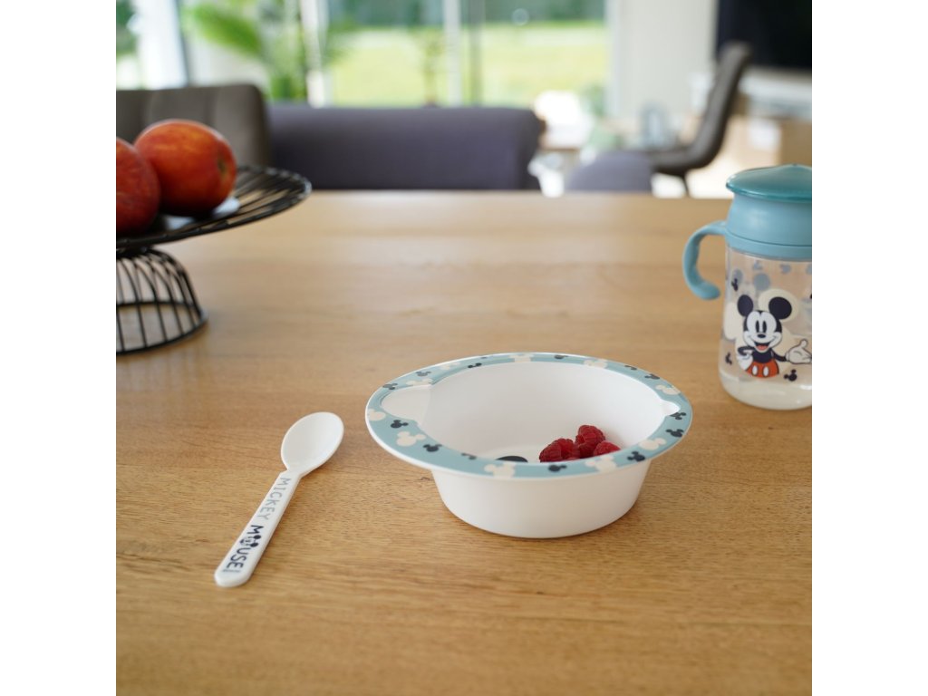 VŠE PRO PRVNÍ PŘÍKRMY: UČÍCÍ HRNÍČEK S OUŠKY, SET 2 LŽIČEK, MISKA S PŘÍSAVKOU A KOUSÁTKO NA OVOCE Disney Mickey