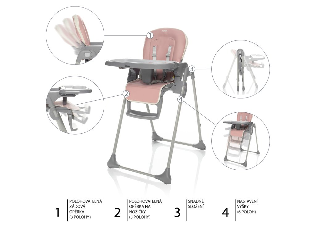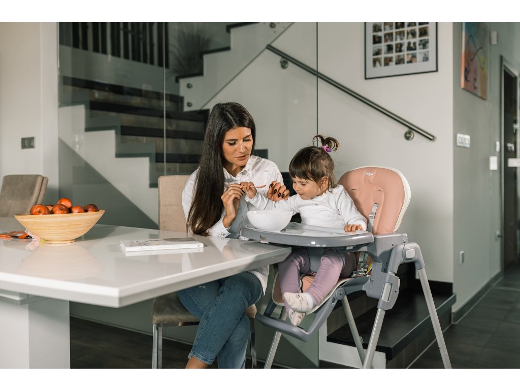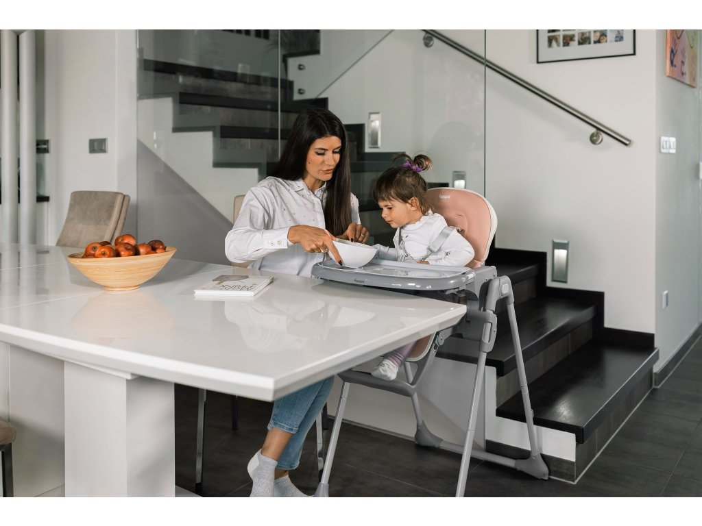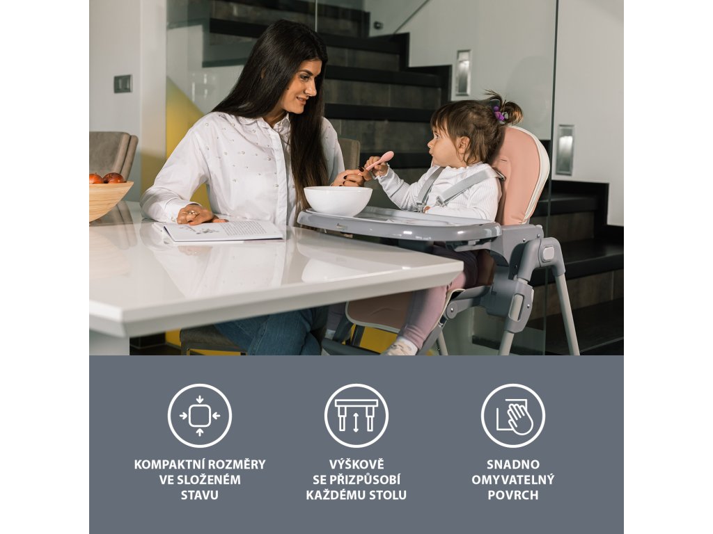 Židličku lze snadno nastavit tak, aby sezení v ní bylo co nejpohodlnější. Nastavitelnou zádovou opěrku lze polohovat do 3 pozic. Samozřejmostí je nastavení výšky do 6 různých poloh. Nastavit je možné i opěrku pro nožičky. Do odnímatelného pultíku je vsazen tác, který lze samostatně vytáhnout. Potah židličky je omyvatelný a případě ušpinění jej stačí otřít vlhkým hadříkem. Pro co největší bezpečí dítěte je židlička vybavena 5bodovým bezpečnostním pásem.