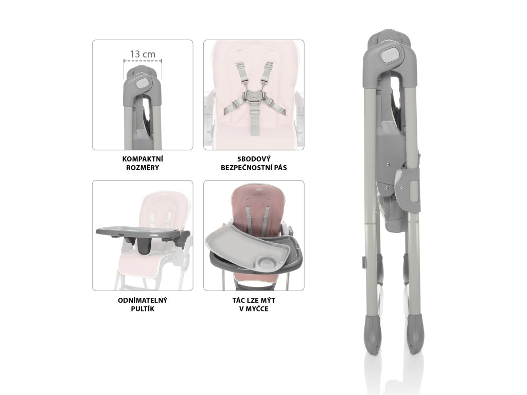 Židlička, která se plně přizpůsobí potřebám rodičů i dětí. Pevná stabilní konstrukce je velmi lehká a dá se snadno složit pomocí dvou pojistek po stranách. Ve složeném stavu sama stojí na místě. Díky kompaktním rozměrům lze složenou židličku umístit i do malých prostorů. Po složení má šířku pouhých 13 cm.