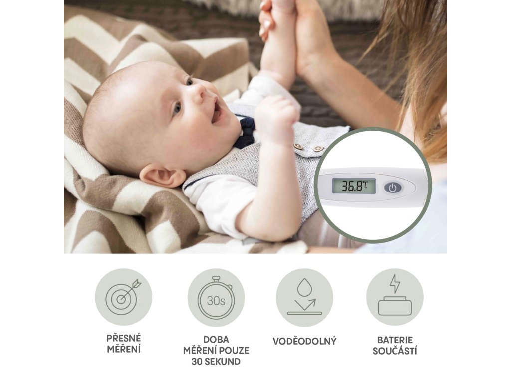 S přesností 0,1 °C v rozsahu od 32,0 °C do 43,0 °C je tento teploměr ideální pro přesné měření. Je vhodný pro rektální, orální i měření pod paží, takže jej mohou používat jak děti, tak i dospělí. Teploměr je vybaven zvukovým signálem, který vás upozorní na konec měření nebo na zvýšenou teplotu, což vám umožní rychle reagovat. Měření teploty probíhá do 30 sekund, což oceníte zejména při měření teploty u neklidných dětí. Voděodolný design zajišťuje bezpečné a snadné čištění teploměru, a pružná silikonová špička zajišťuje komfortní a bezpečné použití bez rtuti.