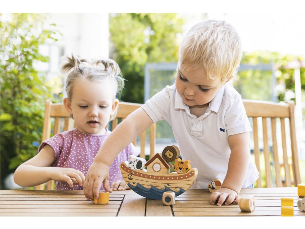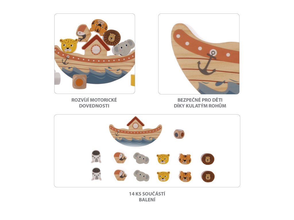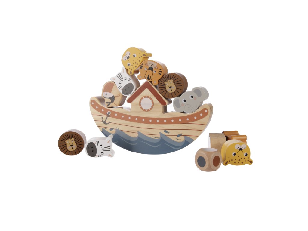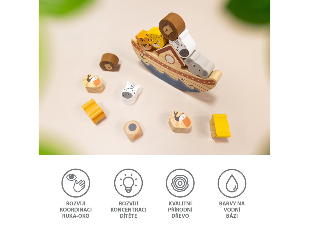 Žádné zvířátko nesmí přes palubu!Hrajte sami nebo ve více lidech, děti, dospěli, babičky, dědečkové – tahle zábavná hra bude bavit všechny! Postupně naloďte všechna dřevěná zvířátka na palubu, ale pozor! Čím více zvířátek na palubě je, tím více hrozí, že se archa převrhne, nebo zvířátka z l...