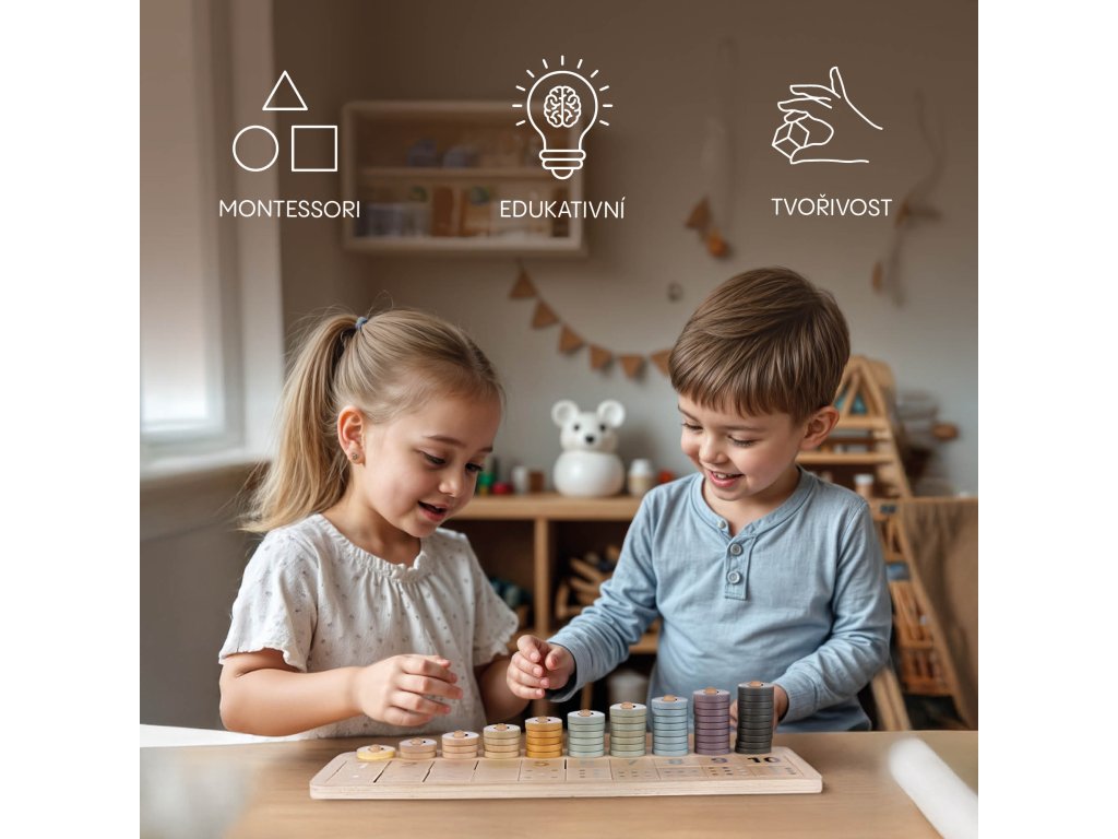 Zábavné učení čísel pro děti Objevte svět čísel hravou a přirozenou cestou! Dřevěná Montessori hra Počítání je ideální pomůcka pro malé objevitele, kteří se právě začínají seznamovat s čísly, barvami a základní matematikou. Vychází z principů Montessori pedagogiky a podporuje logické myšlení, jem...