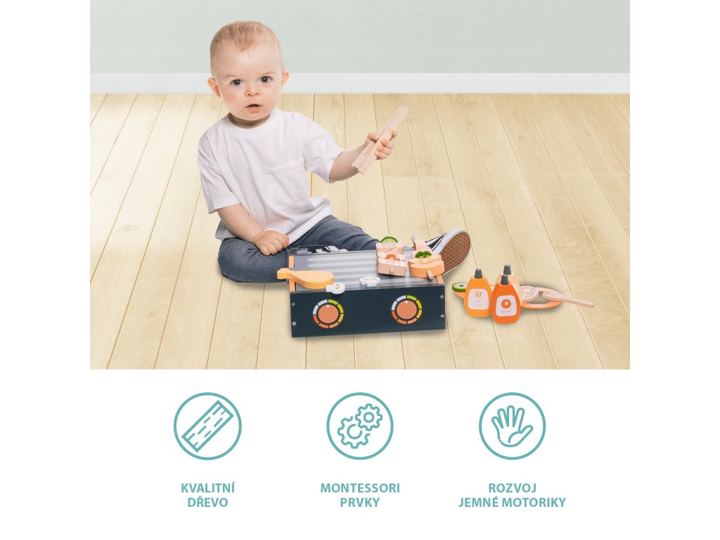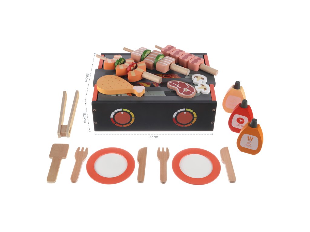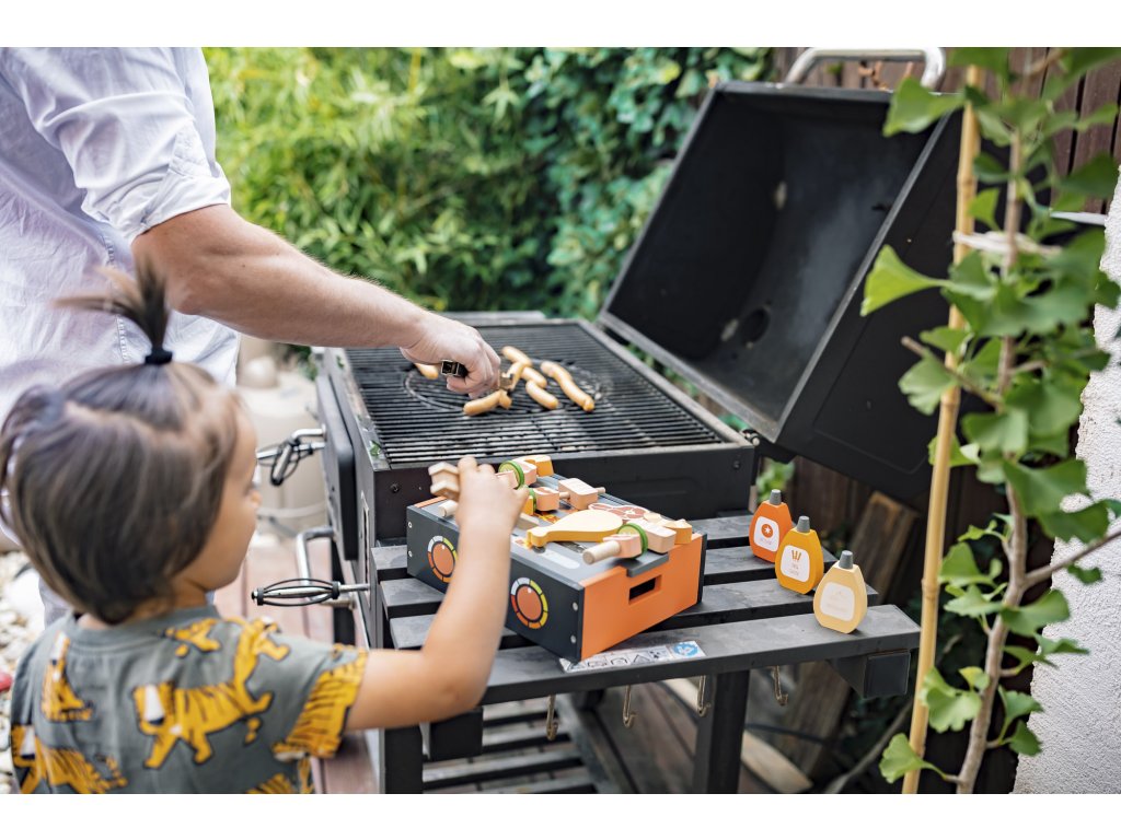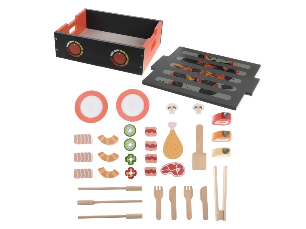 Dřevěný gril slouží zároveň jako úložný box pro všechny ingredience, které si dítě chce ugrilovat. Stačí odsunout vrchní grilovací desku a pod ní se nachází dřevěné maso, zelenina, omáčky, přílohy, ale také talíř, příbory a nástroje pro grilování. Hračka je vyrobena z odolného bukového dřeva a všechny použité barvy jsou zdravotně nezávadné a na vodní bázi.