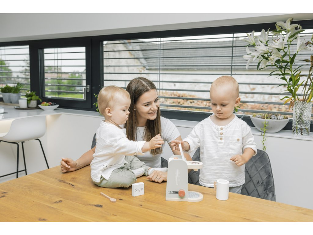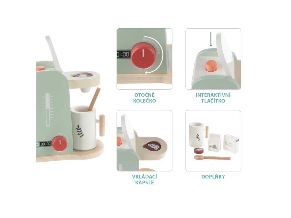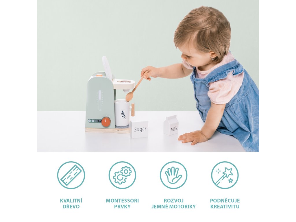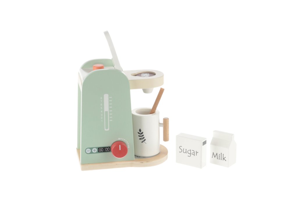 Propracovaný dřevěný kávovar přímo zve k přípravě dobré kávy. Kávovar má několik tlačítek, které lze otáčet nebo stlačit. Součástí je velký dřevěný šálek se lžičkou a suroviny na přípravu kávy. Hračka je vyrobená z kvalitního dřeva a barev na vodní bázi.