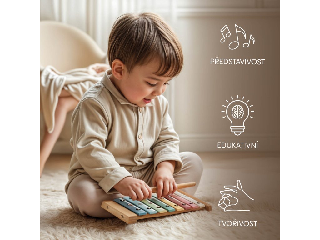 Hudba rozvíjí fantazii, kreativitu i motoriku – a přesně k tomu slouží krásný dřevěný xylofon ZOPA Deluxe, inspirovaný principy Montessori pedagogiky. Ideální pro děti od 12 měsíců, tento edukativní hudební nástroj podporuje samostatné objevování zvuků, rytmu i barev zcela přirozeným způsobem.
