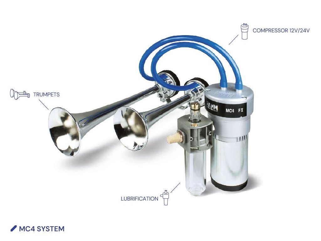 MC4 systém s trubkami řady TP je vyvíjen a vyráběn společností FIAMM Itálie pro bezpečnostní a zásahová vozidla. FIAMM je lídrem v těchto výstražných zařízeních. MC4 systém lze instalovat na každý typ vozidla. MC4 kompresor je určen pro napětí 24V. MC4 systém je schválen proti elektromagnetickému rušení v souladu restriktivní normou CEE 2009/19 a EHK Reg.10. Elektro-pneumatický systém MC4 je ideální pro životně důležité naléhavosti v hustém provozu. Doporučuje se montáž maznice, která zlepšuje výkonnost MC4 systému a udržuje celý systém.