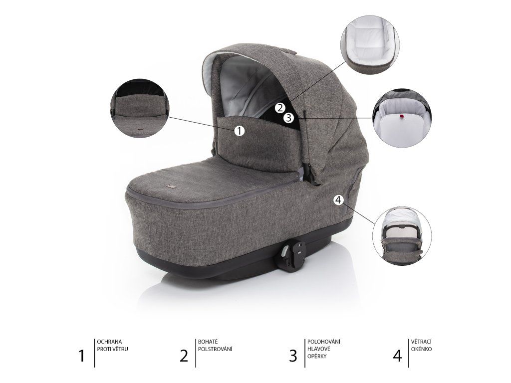 Hlubokou korbu můžete po sejmutí z podvozku využít buď jako kolébku, třeba na návštěvě. Anebo s pomocí zajištění na spodní straně docílíte, že korbička bude pevně stát. U stříšky je pak nezbytnou součástí sluneční clona. Přičemž korba je dále vybavena madlem pro přenášení, elegantně skrytým ve stříšce kočárku. Tímto způsobem madlo nijak nenarušuje vzhled kočárku.