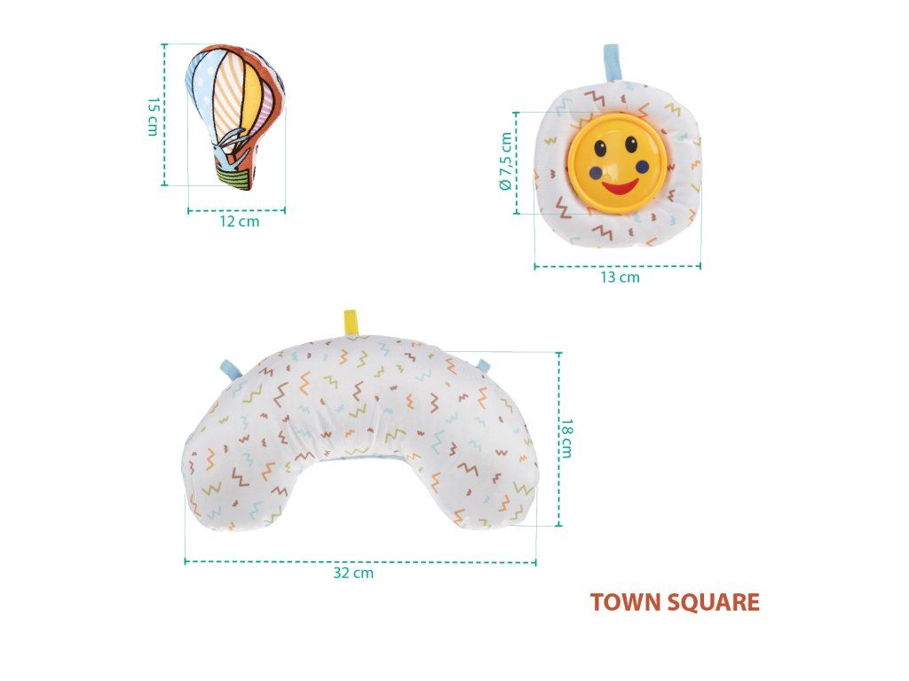 Součástí aktivity deky je tvarovaný polštářek, který se stane skvělým pomocníkem při „pasení koníčků“. Děti díky němu získají potřebnou oporu. Na polštářek lze připojit závěsné hračky, díky poutkům nebudou děťátku nikam utíkat, ale motivují ho ke správnému držení tělíčka. Polštářek později využijete také při tréninku lezení, kdy jej dáte děťátku pod bříško.