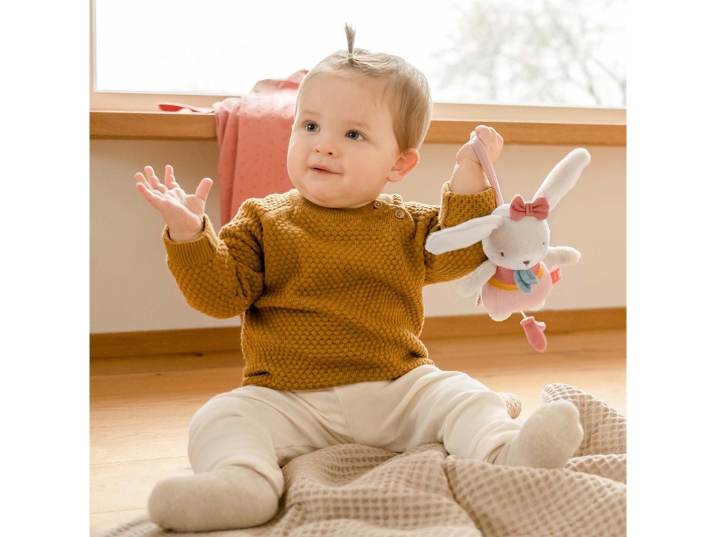 Králíček je nejen skvělá plyšová hračka, ale také se díky dvěma popruhům může snadno připevnit k dětské postýlce, kočárku nebo autosedačce. Stane se tak ideálním společníkem na cestách! A vaše děťátko se bude cítit více v bezpečí a komfortně i na místech, kde je poprvé, což by pro malé děti může být rozrušující.