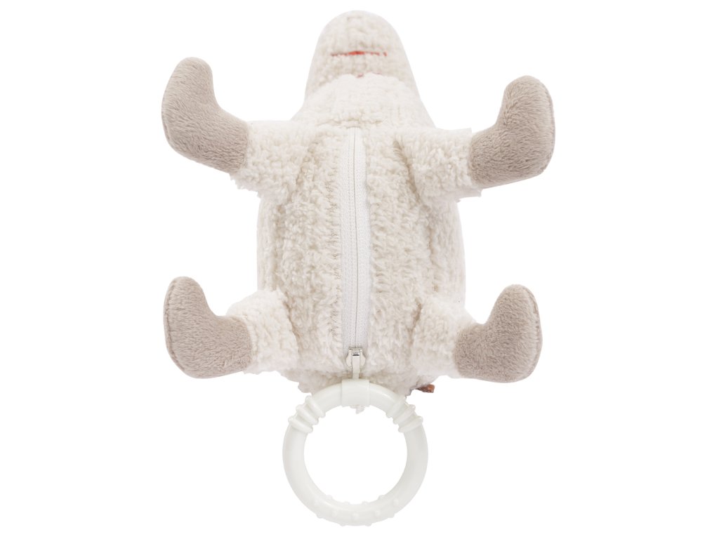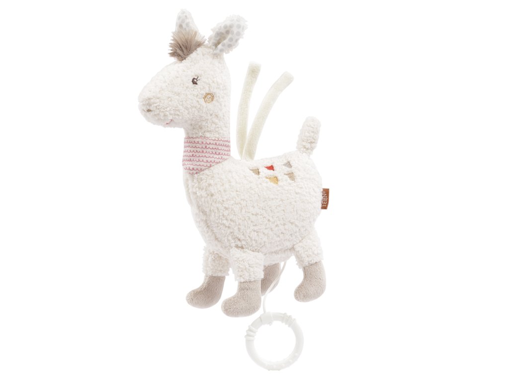 Plyšová lama s hracím strojkem, který se spouští zatažením za kroužek. Strojek lze vyjmout, hračka má zip. Příjemné tlumené barvy, a měkký materiál, to vše vybízí k mazlení a dítě uklidňuje. Díky dvěma páskům hračku rychle připevníte na kočárek, dětské sedačky a dětskou postýlku