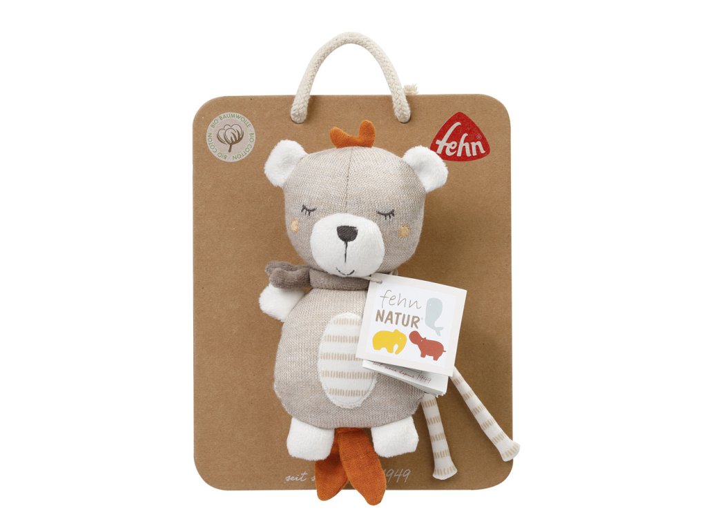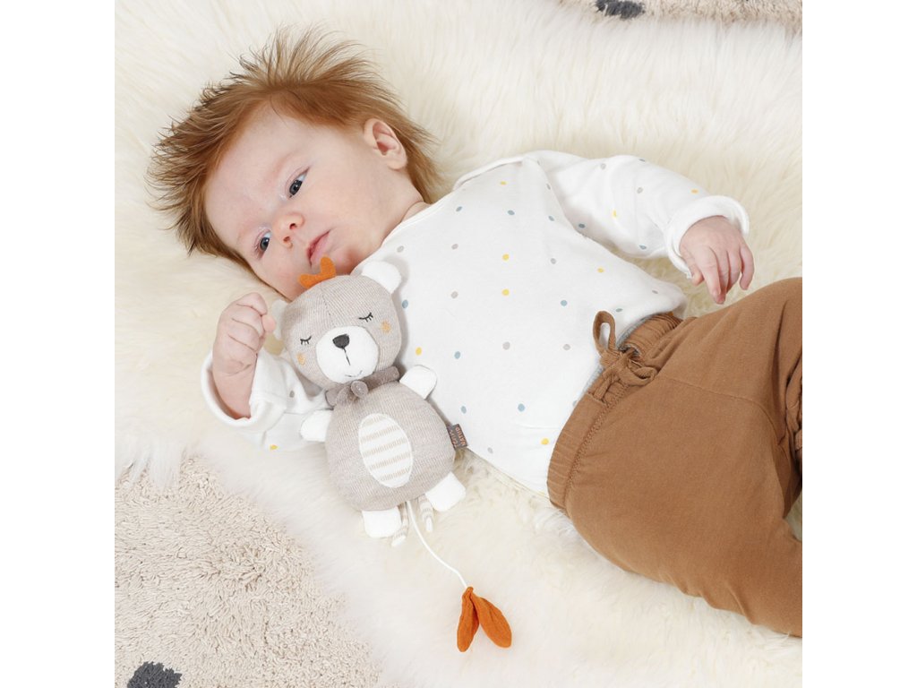 Hrací hračka medvídekHrací kamarád na doma i na cestyRoztomilý měkký plyšový medvídek je vyrobený z certifikované organické bavlny. Uvnitř plyšové hračky se nachází natahovací mechanismus, který po zatáhnutí hraje ukolébavku s příjemnou hlasitostí. Dvě praktické stuhy umožňují hračku připev...