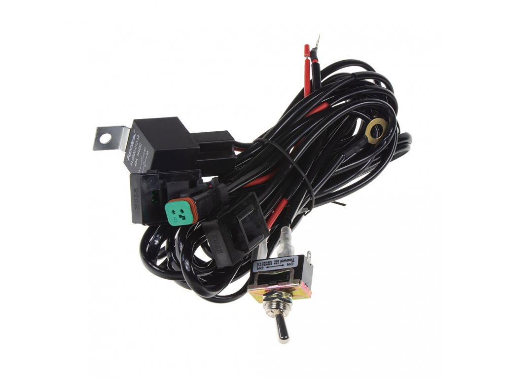 Kabelová sada pro pracovní světla, včetně spínače a relé. Sada je zakončena jedním konektorem.