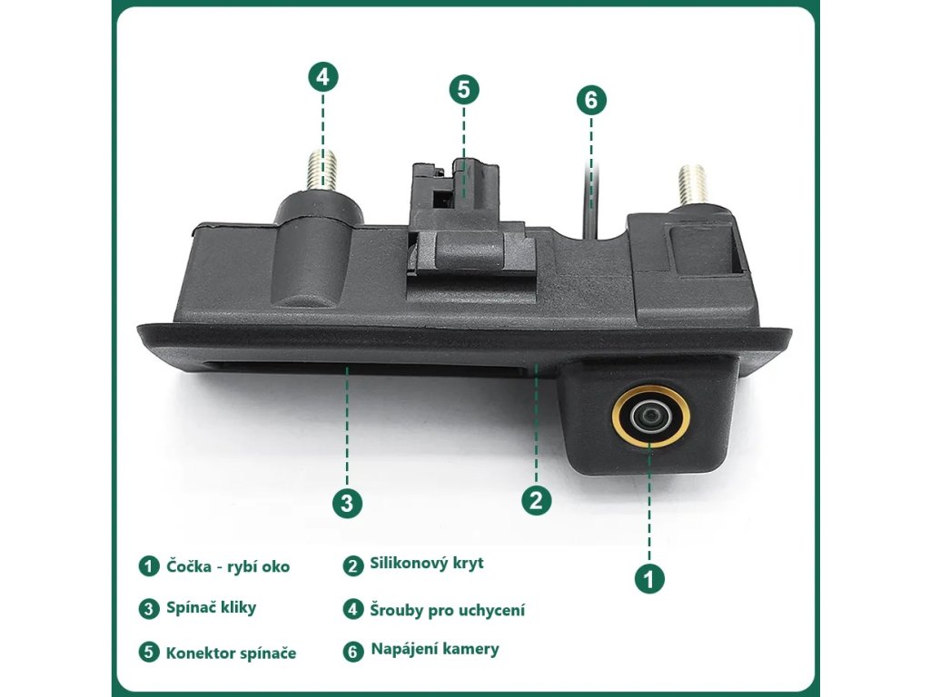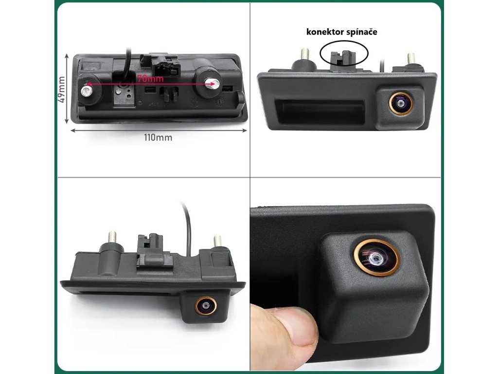 Barevná AHD/CVBS kamera integrovaná do ovladače kufru. Vhodné např. pro kombinaci s monitorem, nebo s adaptéry mi-xxx pro připojení k originální navigaci. Montáž: Vyjmete spínač kufru nad zadní SPZ a místo něj vložte do originálního otvoru tuto kameru, která zároveň nahradí původní spínač kufru.