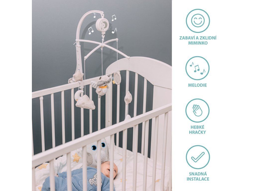 Rozpohybované plyšové hračky v jemných barvách přírodních motivů, kterým dominuje roztomilé zvířátko, doprovází několik příjemně sladkých melodií. To vše u děťátka podporuje sluchové, motorické a vizuální vjemy. V jeho postýlce se tak navodí příjemná atmosféra, která děťátko lehce zklidní a jemně provede až do říše snů.