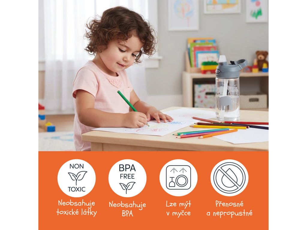 Láhev tritan sport 480 ml – Lehká, odolná a připravená na všechno Hledáte láhev, která přežije každé dětské dobrodružství? Naše sportovní láhev z tritanu s objemem 480 ml je lehká, odolná a skvěle se hodí na jakékoli cesty. Je vyrobena z materiálů bez toxických látek, takže je pro vaše dítě napro...