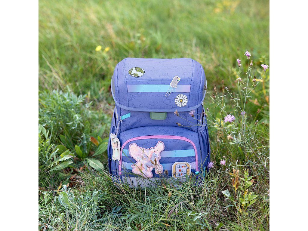 Praktický šestidílný školní set obsahuje: školní batoh, sportovní vak, velký vybavený penál, malý penál se zipem, pláštěnku a sadu skládající se ze 2 nášivek určených k ozdobení setu.