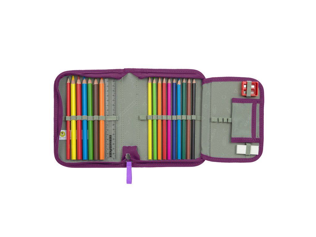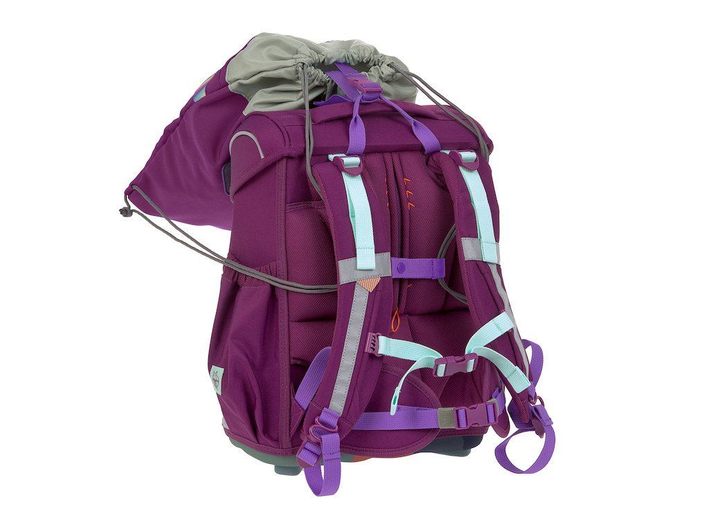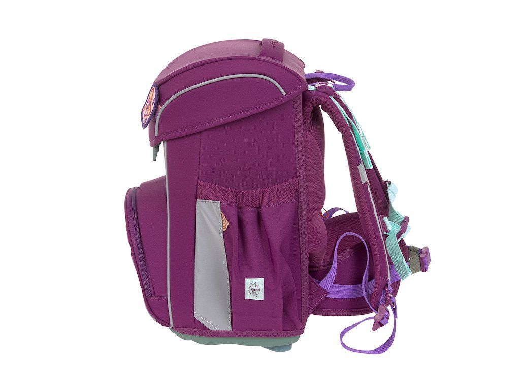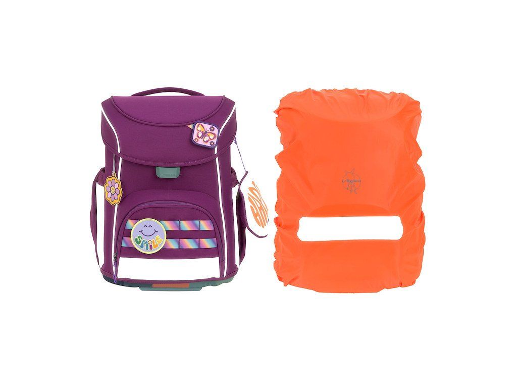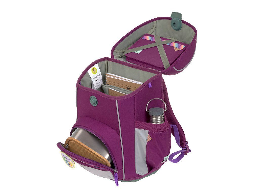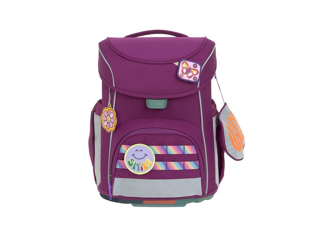 Praktický sedmidílný školní set obsahuje: školní batoh, sportovní vak, velký vybavený penál, kapsičku na krk, malý penál se zipem, pláštěnku a sadu skládající se z přívěsku a 2 nášivek určených k ozdobení setu.