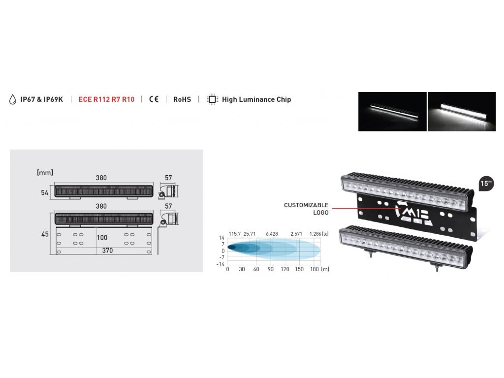 54 W (18 ks 3 W) obdélníkové profesionální LED světlo na pracovní stroje, vhodné zejména pro offroad vozy a jinou pracovní techniku. Světlo je určeno především pro montáž na přední část vozu nad SPZ. Technické parametry • rozptýlený/bodový paprsek světla + poziční světlo (pruh) • 18...