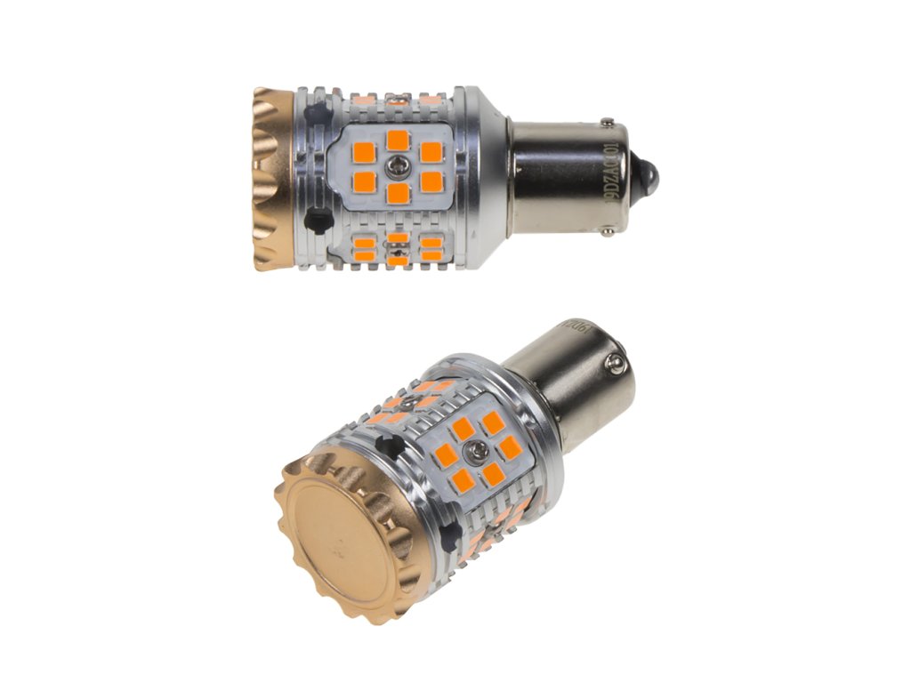 Nová generace LED autožárovek s paticí BAU15S, oranžová, 30x LED čip 3030SMD. Díky speciální vestavěné elektronice simuluje stejný odběr jako klasická žárovka a nehlásí chybu ve vozidlech se systémem hlídání prasklých žárovek. Určeno do směrových světel (blinkrů), žárovky blikají správnou rychlostí.