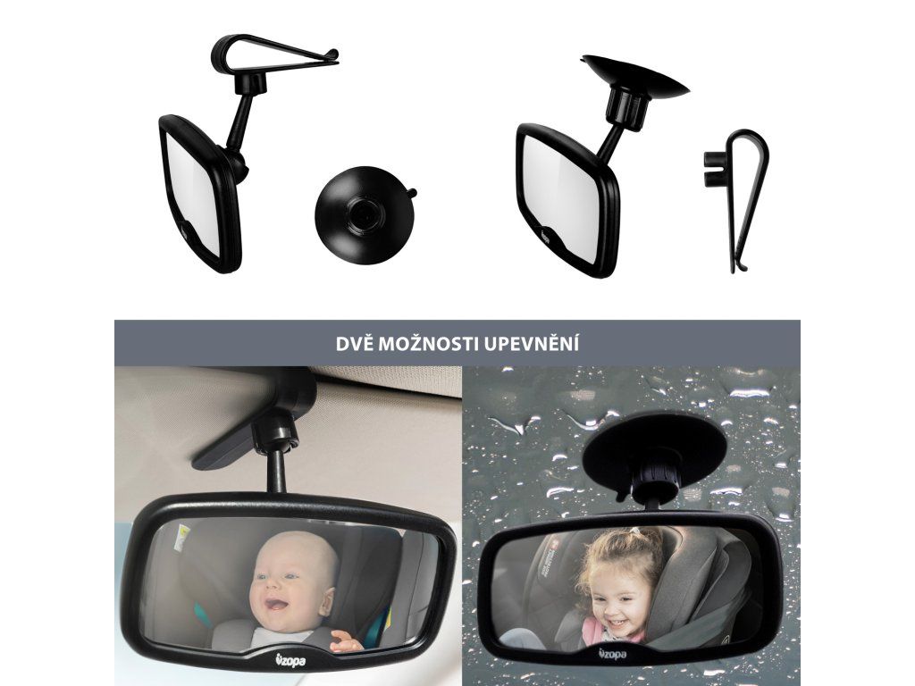 Abyste měli jako řidič přehled o všem, co se ve voze děje, jak se vzadu baví nebo odpočívají vaše děti, je tu malé zpětné zrcátko, které díky vypouklé konstrukci zásadně rozšiřuje váš zorný úhel. Zrcátko je otočné o 360°, takže si ho můžete nastavit naprosto podle svých potřeb. Lze ho umístit pomocí přísavky na čelní sklo nebo pomocí klipu na sluneční clonu před řidičem či spolujezdcem.