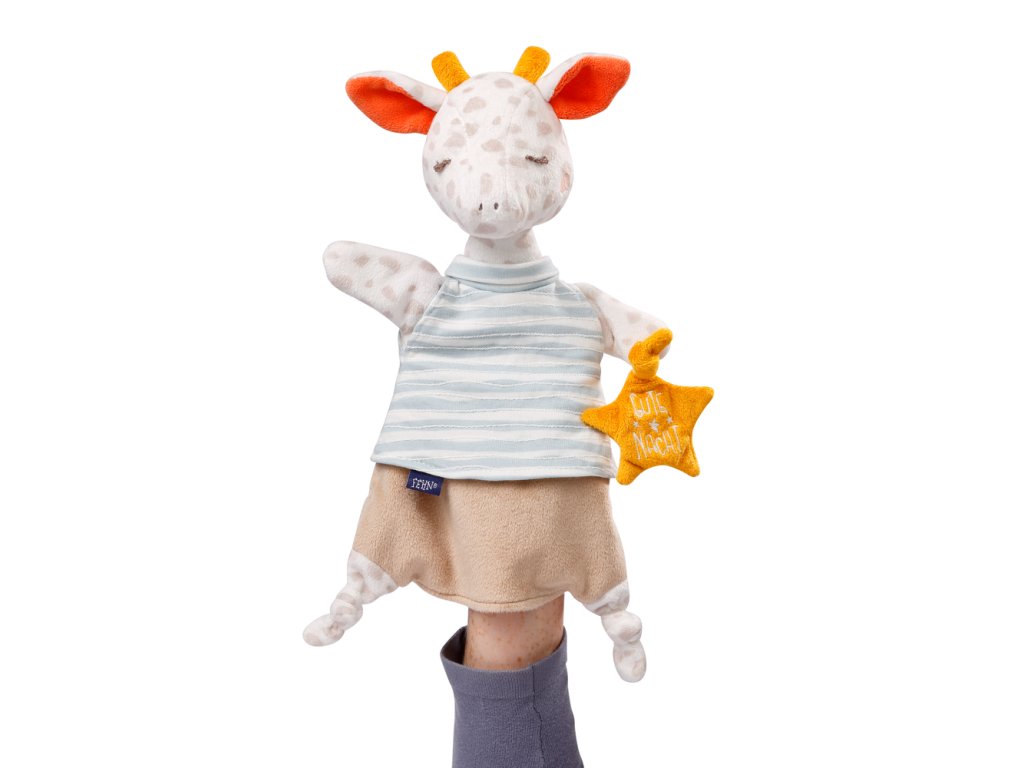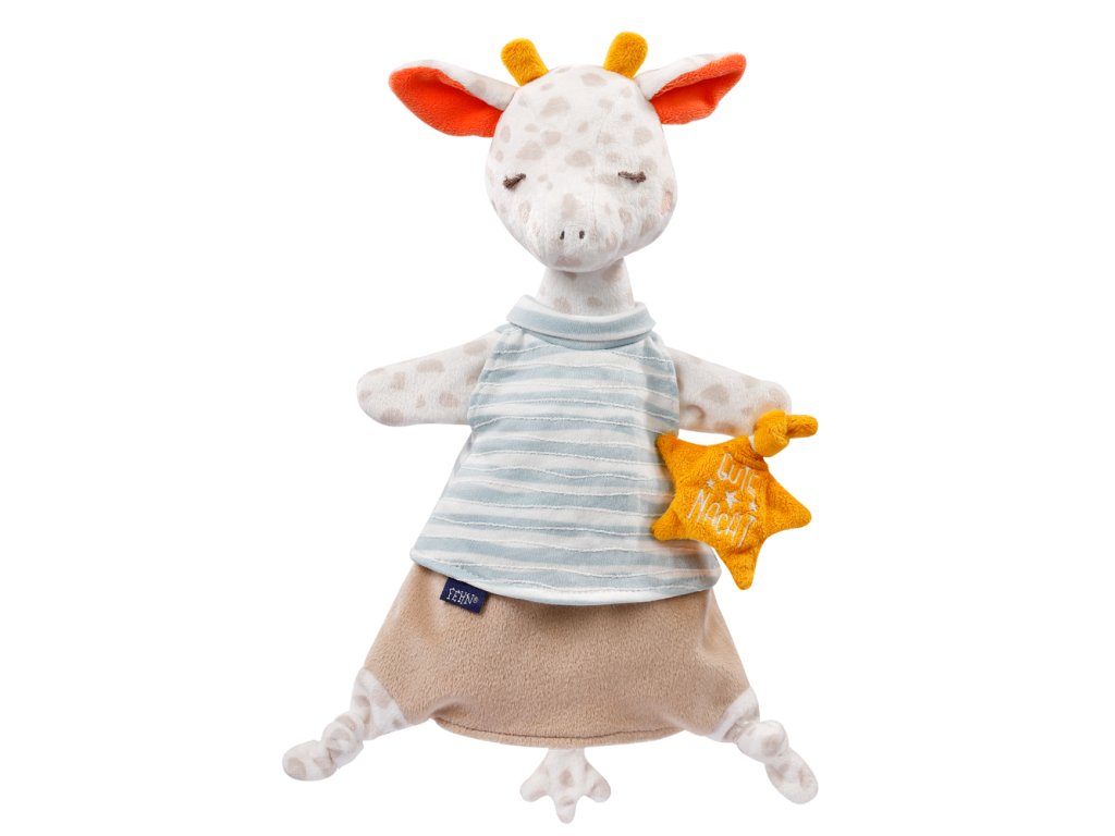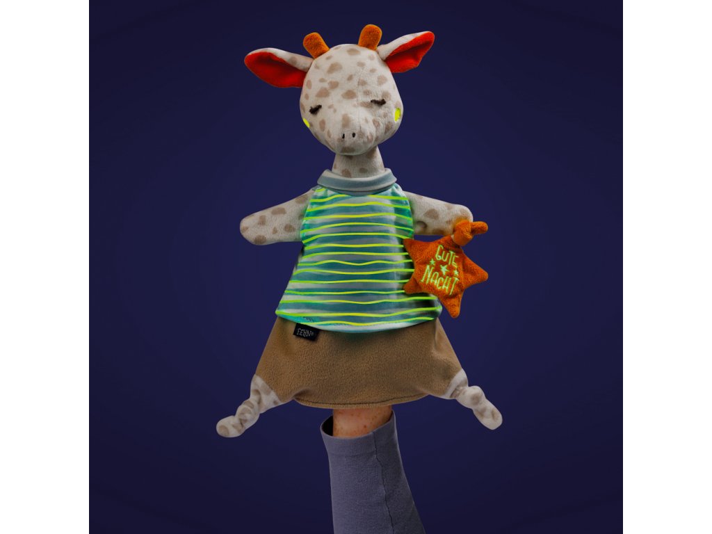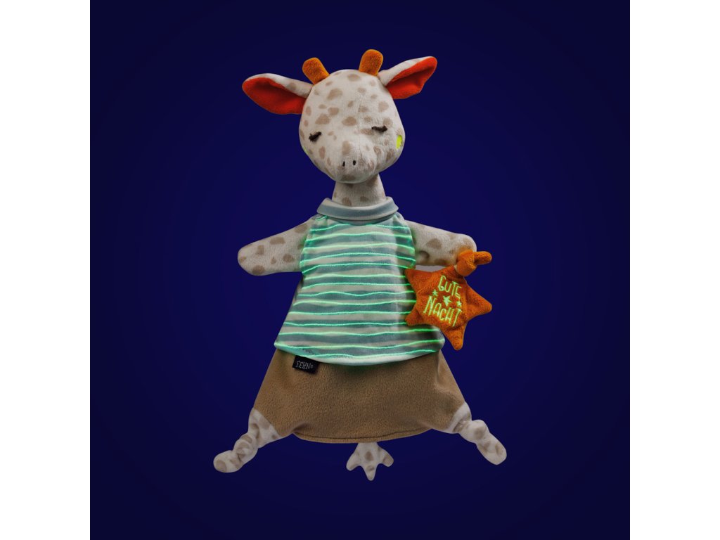 Mazlivý plyšák přes den, večer pak vypravěč pohádek a ochránce klidného spánku – to je maňásek žirafa z kolekce Gute Nacht. Roztomilá plyšová hračka z jemného veluru bude věrným společníkem pro vaše dítě. Lze ji využít jako maňáska, pomocí kterého můžete vaše dítě naučit novým dovednostem, vyprávět pohádky před spaním či jen cvičit jeho představivost a fantazii. Svítící prvky navodí u dítěte pocit bezpečí a pomohou mu lépe usínat.
