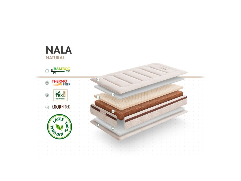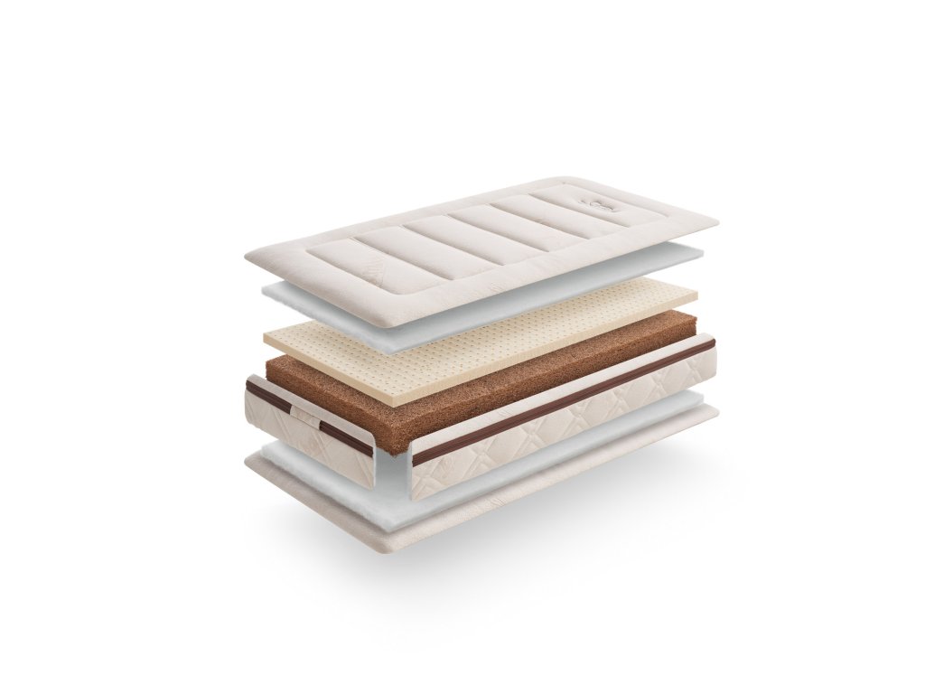 Jádro vyrobené z kokosového vlákna je 100% přírodní a ekologické. 100% přírodní latex poskytuje vysokou prodyšnost a optimální větrání.