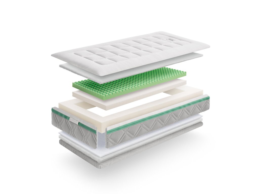 Měkká a děrovaná pěna v kombinaci s paměťovou pěnou se přizpůsobí tělu dítěte, tak aby získala co nejvíce možnou prodyšnost.