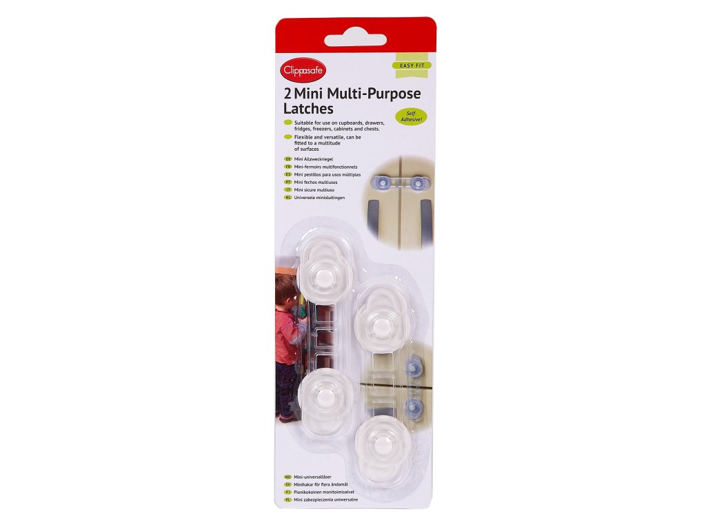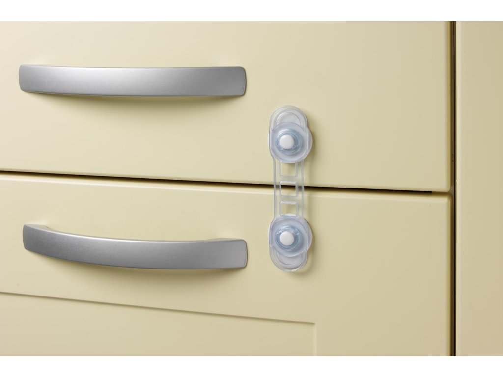 Víceúčelová pojistka Clippasafe je snadno použitelná a pomáhá zabránit dětem otevírat skříně, zásuvky, lednice, mrazáky, skříňky a bedny.