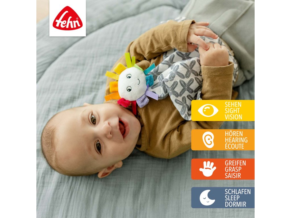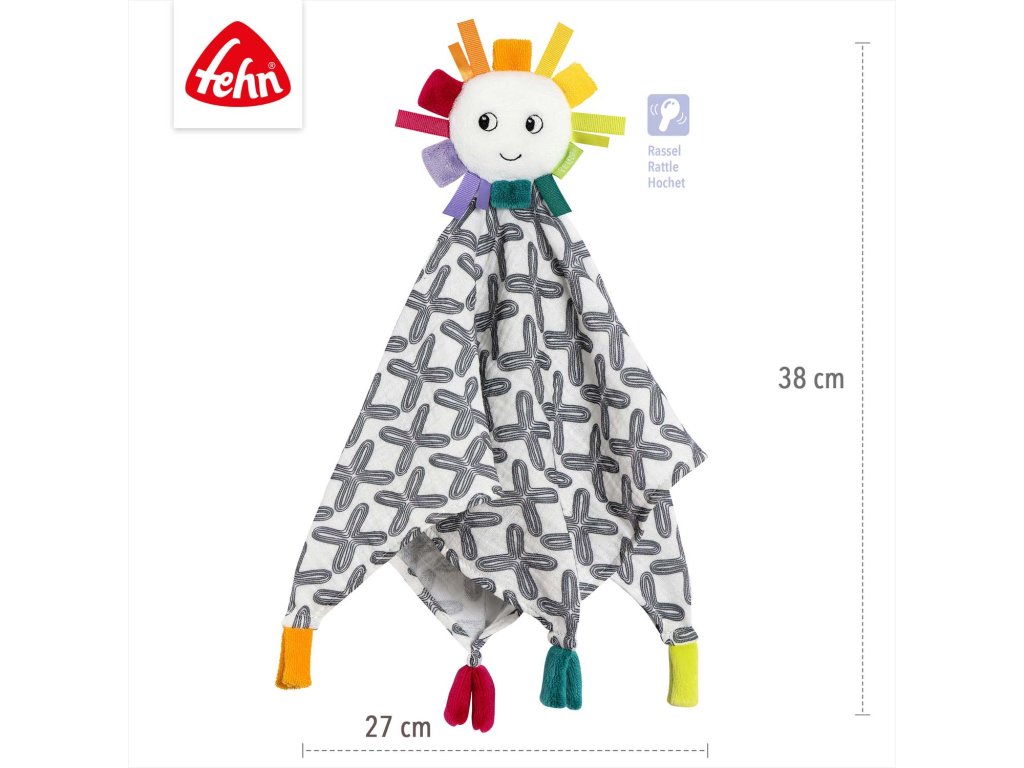 bezpečí. Měkké materiály a našité barevné paprsky sluníčka lákají k uchopení,
