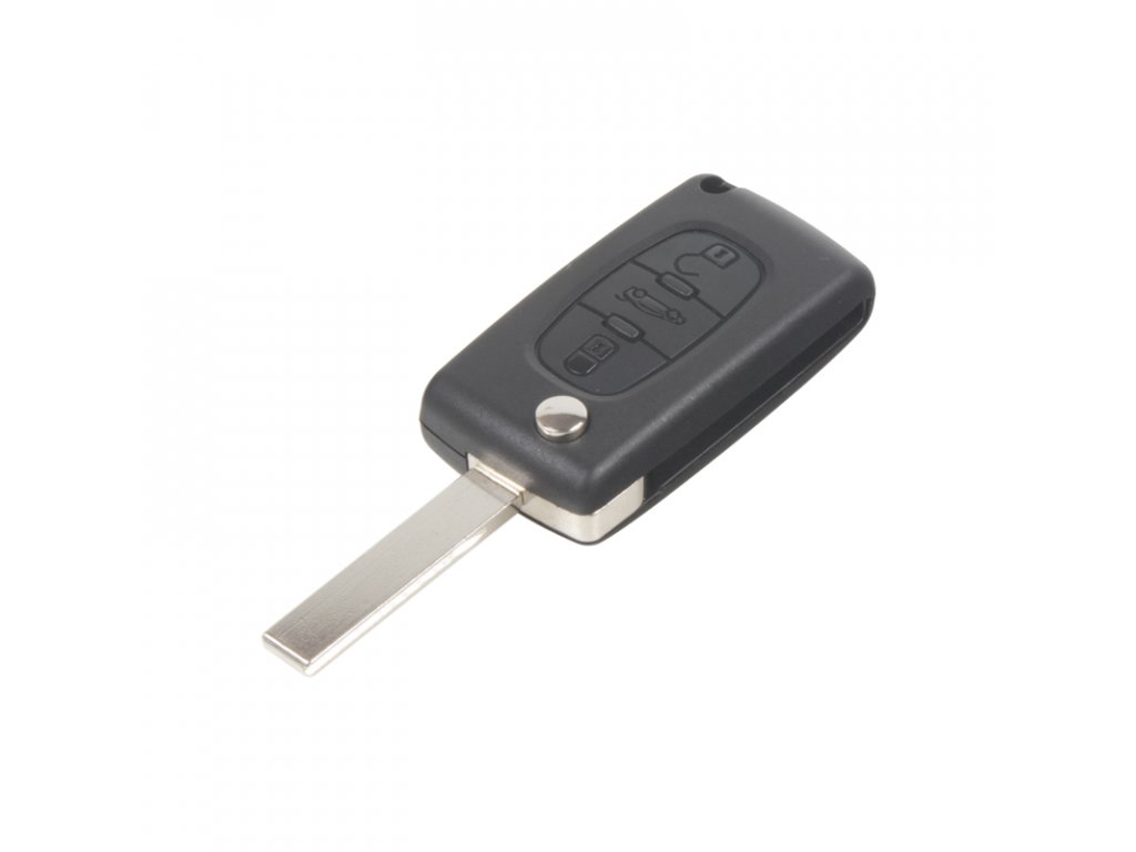 Náhradní vystřelovací autoklíč s dálkovým ovladačem pro vozy Citroën. Součástí klíče je planžeta, dálkové ovládání centrálního zamykání se třemi tlačítky a čip ID 46 pro imobilizér. Náhrada originálního ovladače.