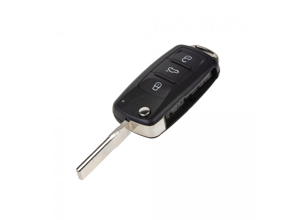 Náhradní vystřelovací autoklíč s dálkovým ovladačem pro vozy koncernu VW. Součástí klíče je planžeta, dálkové ovládání centrálního zamykání se třemi tlačítky a čip ID 48 pro imobilizér. Planžetu klíče je třeba nechat vyfrézovat podle tvaru originálního klíče, vyřezaný klíč s čipem je nutno naprogramovat do řídící jednotky vozu a dálkové ovládání je třeba spárovat s komfortní jednotkou vozu.