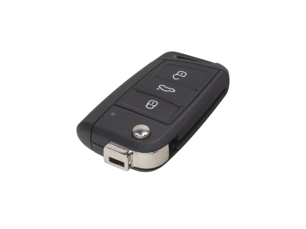 Náhradní vystřelovací autoklíč s dálkovým ovladačem pro vozy koncernu VW. Součástí klíče je dálkové ovládání centrálního zamykání se 3 tlačítky a čip ID 48 pro imobilizér. Planžetu klíče je třeba nechat vyfrézovat podle tvaru originálního klíče nebo přendat z původního klíče (není součástí), vyřezaný klíč s čipem je nutno naprogramovat do řídící jednotky vozu a dálkové ovládání je třeba spárovat s komfortní jednotkou vozu.