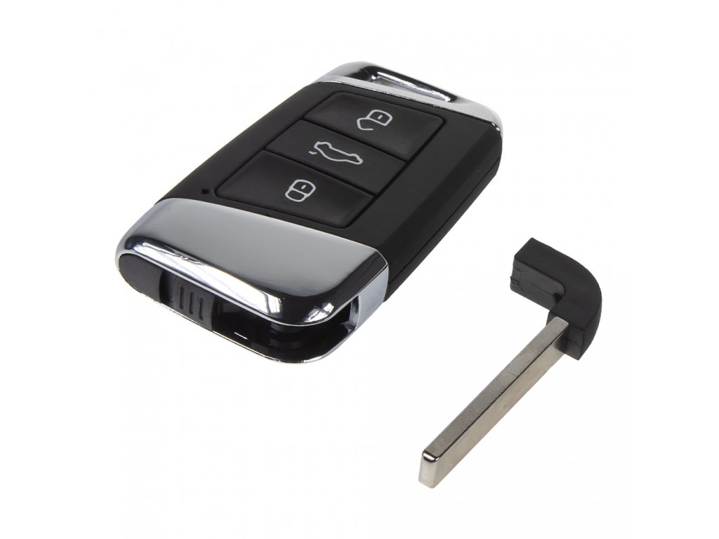 Náhradní autoklíč s dálkovým ovladačem pro vozy koncernu VW. Součástí klíče je planžeta, dálkové ovládání centrálního zamykání se třemi tlačítky a čip MQB48 pro imobilizér. Planžetu klíče je třeba nechat vyfrézovat podle tvaru originálního klíče, vyřezaný klíč s čipem je nutno naprogramovat do řídící jednotky vozu a dálkové ovládání je třeba spárovat s komfortní jednotkou vozu.