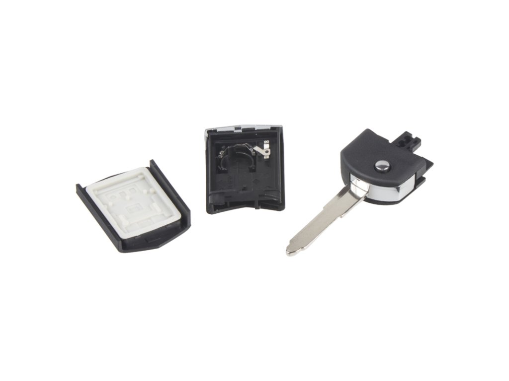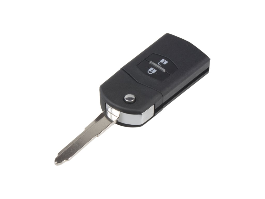 Náhradní obal vystřelovacího klíče pro vozy Mazda s 2-tlačítkovým ovladačem (bez elektroniky a čipu imobilizéru). Do klíče je nutno vložit z původního klíče elektroniku dálkového ovládání a čip imobilizéru (transpondér), planžetu klíče je třeba nechat vyfrézovat podle tvaru originálního klíče.
