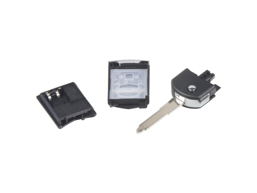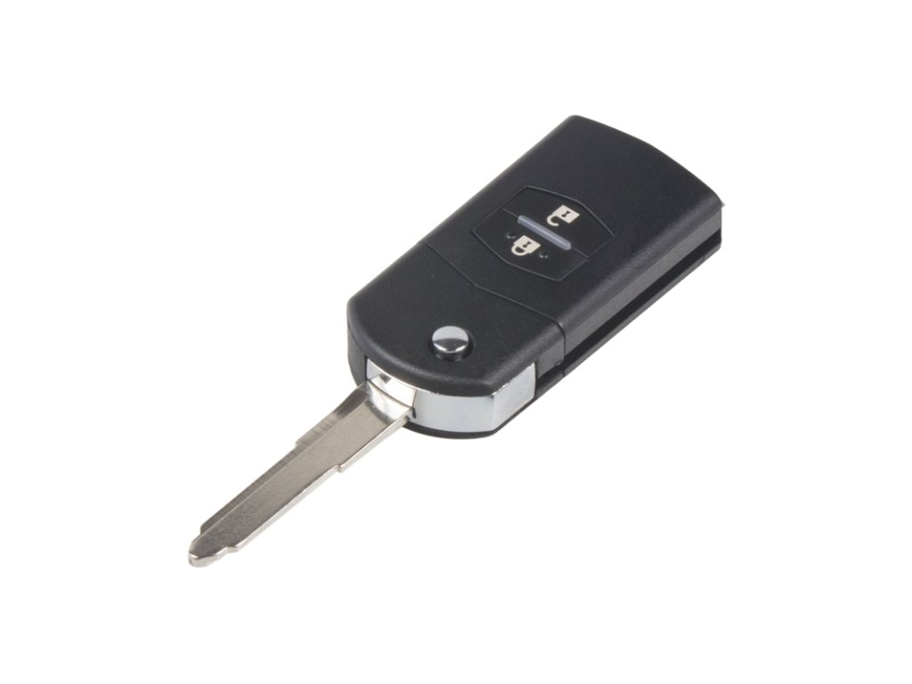 Náhradní obal vystřelovacího klíče pro vozy Mazda s 2-tlačítkovým ovladačem (bez elektroniky a čipu imobilizéru). Do klíče je nutno vložit z původního klíče elektroniku dálkového ovládání a čip imobilizéru (transpondér), planžetu klíče je třeba nechat vyfrézovat podle tvaru originálního klíče.