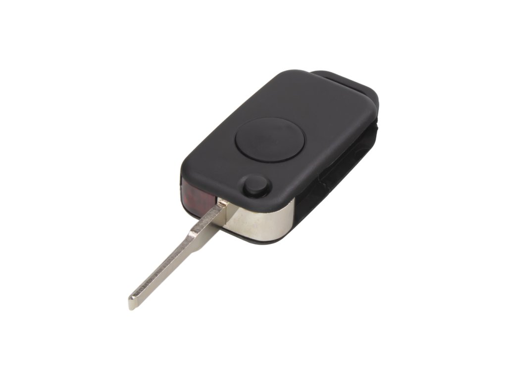 Náhradní obal vystřelovacího klíče pro vozy Mercedes s 1-tlačítkovým ovladačem (bez elektroniky a čipu imobilizéru). Do klíče je nutno vložit z původního klíče elektroniku dálkového ovládání a čip imobilizéru (transpondér), planžetu klíče je třeba nechat vyfrézovat podle tvaru originálního klíče.