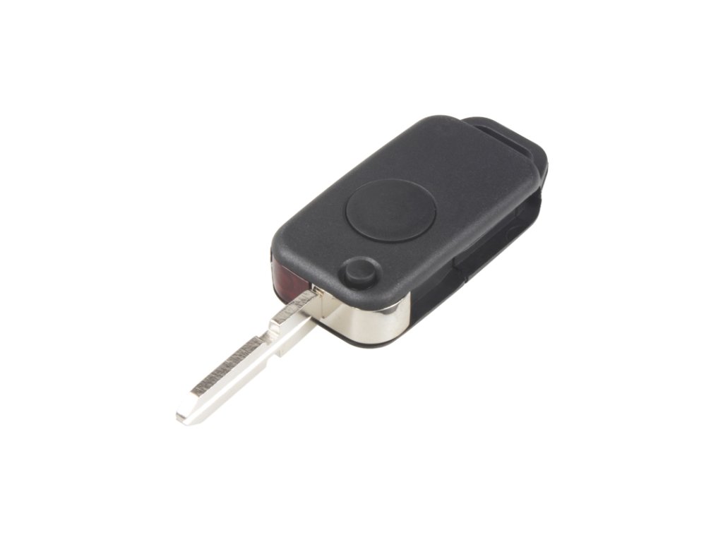 Náhradní obal vystřelovacího klíče pro vozy Mercedes s 1-tlačítkovým ovladačem (bez elektroniky a čipu imobilizéru). Do klíče je nutno vložit z původního klíče elektroniku dálkového ovládání a čip imobilizéru (transpondér), planžetu klíče je třeba nechat vyfrézovat podle tvaru originálního klíče.