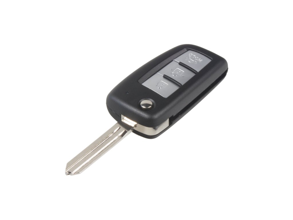 Náhradní obal klíče pro vozy Nissan s 3-tlačítkovým ovladačem (bez elektroniky a čipu imobilizéru). Do klíče je nutno vložit z původního klíče elektroniku dálkového ovládání a čip imobilizéru (transpondér), planžetu klíče je třeba nechat vyfrézovat podle tvaru originálního klíče.